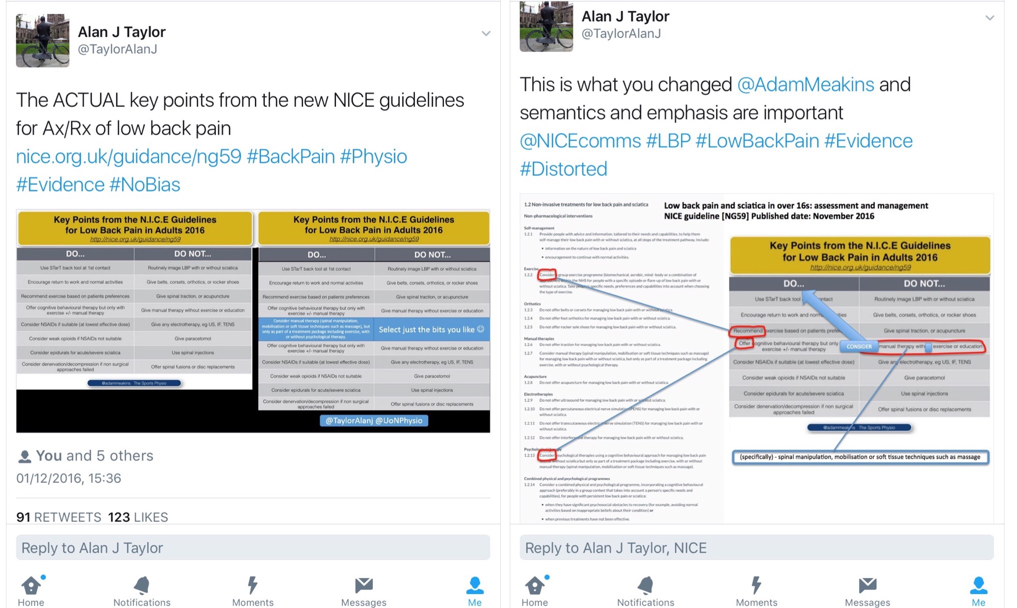I can both love and hate Twitter at times, but it does give me some ideas for blogs, such as this one, which I had no plans to write until certain events unfolded recently over what I thought was a simple, helpful tweet I posted on the latest NICE guidelines for low back pain here.